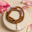 Kontrast tvarů—zemité, hluboce texturované rudraksha s malou částí hladkých, barevných korálků blízko bílého střapce—nabízí jak vizuální klid, tak snadný způsob, jak vnímat pokrok podél řetízku. Střapec označuje jemný bod zastavení v praxi. 🕯️