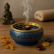 Tichá nádoba na pryskyřici a uhlíky, tato hluboká modrá nádoba na vonné tyčinky zve k pomalému rytmu ve vašem prostoru. Vyrobeno v Indii—kde vonné tyčinky doprovázejí jak každodenní život, tak obřady—nese jemné záření kovu a něžný vzestup voňavého kouře s klidnou grácií. 🕯️