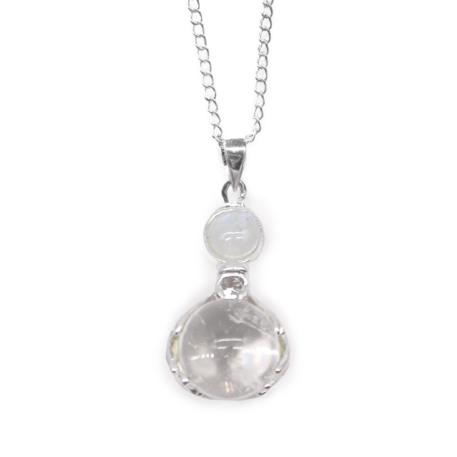 Chladný, průhledný křišťál zachycuje světlo, když spočívá blízko srdce – malý kulatý kámen nad broušenou kapkou, držený v hladkých stříbrných rámečcích na štíhlém kabelovém řetízku. Tichý společník, čistý na pohled a klidný na dotek. ✨