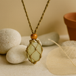 Kámen je hladký a jemně zaoblený, s průsvitným leskem, který zachycuje světlo. Tmavě béžový šňůrka tvoří diamantovou mřížku kolem něj, staženou malou dřevěnou korálkou pro teplý, zemský dotek. Matná šňůrka, lesklý kámen a přírodní dřevo se setkávají v klidné rovnováze. Nastavitelná délka umožňuje nosit jej blízko u klíční kosti nebo níže pro snadný, každodenní vzhled.