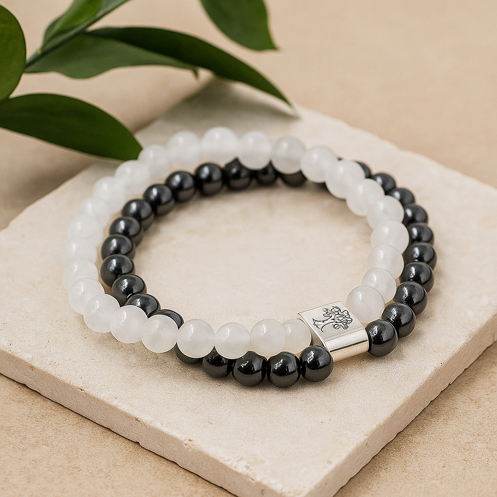 Elegantní na zápěstí, tento korálkový náramek spojuje chladivý, hladký dotek s klidným kontrastem tónů. Průsvitný křišťál stojí vedle lesklého, tmavého kovového hematitu, každý korálek je vyleštěn do vysokého lesku. Jediný stříbrný akcent s nenápadným rytím přidává tichý detail, zatímco nepřetržitá smyčka se snadno nasazuje a usazuje s vyrovnaným, moderním vzhledem. 🤍🖤