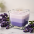 Tiché spojení plamene a vůně: skrze čisté, čistě liniové sklo jemně září vrstvené odstíny bílé, šeříkové a tmavé levandule, jak knot ožívá. Světlo je klidné a stálé; barva a teplo uklidňují místnost. 🕯️