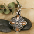 Chladný lesk sterlingového stříbra se setkává s teplým nádechem zlata v přívěsku ve tvaru diamantu, který spočívá blízko srdce. Jeho vystouplý květinový kříž uprostřed zachycuje světlo, zatímco jemné ornamenty a mírně ztmavené prohlubně dodávají tichou hloubku a texturu. ✨