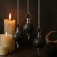 Chladný, leštěný kámen spočívá v dlani. Koule stabilizuje ruku; ostrý hrot sbírá linii. S tichým kyvem na stříbrném řetízku nabízí tento kyvadlo jednoduchý způsob, jak se zastavit, naslouchat vnitřku a soustředit svou pozornost. 🌌
