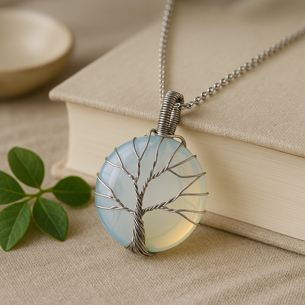 Chladný a hladký na kůži, mléčný opalitový kabošon září měkkým modrobílým leskem, objatý ručně omotaným Stromem života ze stříbrného drátu. Více než ozdoba, nese tichý příběh světla a růstu. 🌳✨