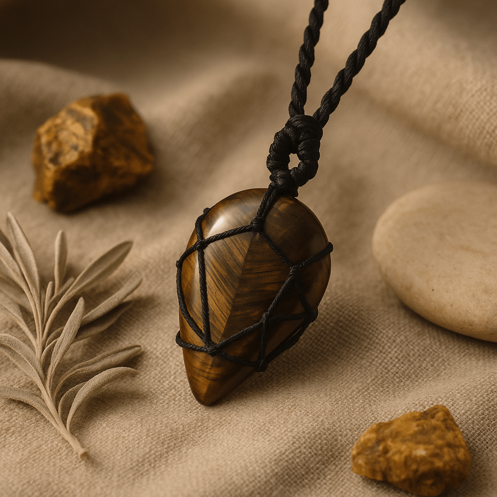 Teplé zlatavě hnědé pásy kloužou pod světlem, když tento leštěný kapkovitý kámen spočívá blízko srdce — tichý společník, který je na dotek hladký a na kůži pevný. Významný doplněk, který nese jemné připomenutí odvahy a jasného vidění v každodenním životě. 🐅