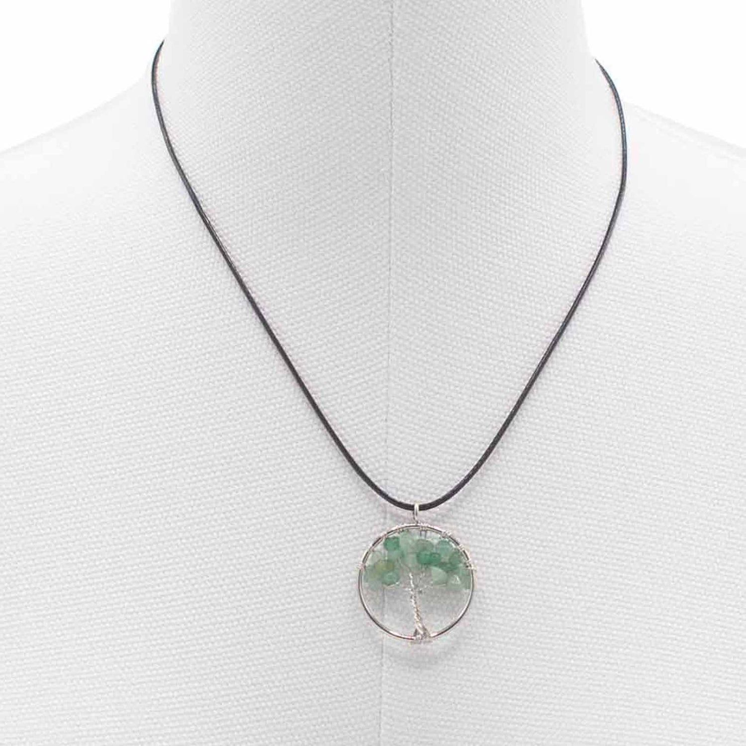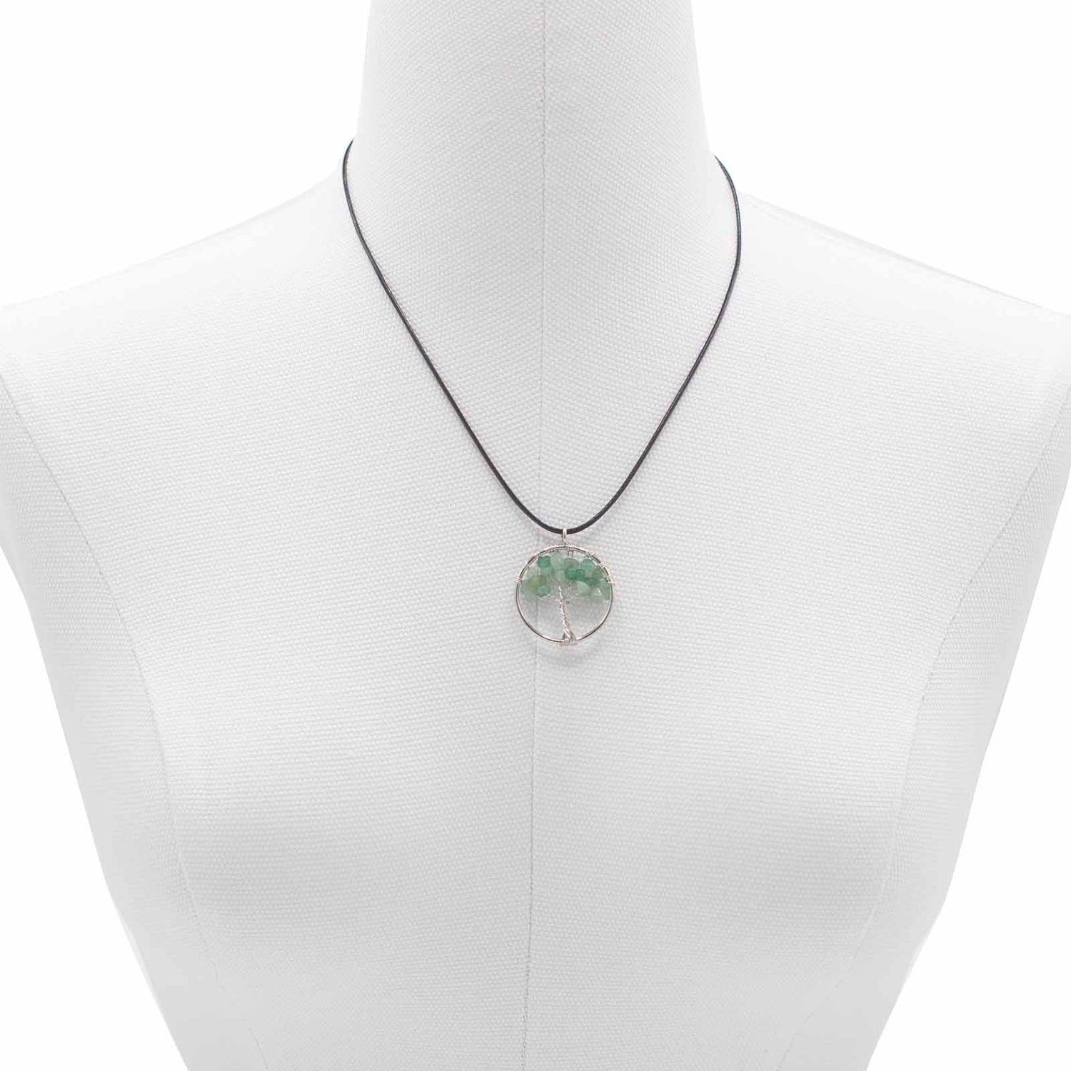 Tento přívěsek, který spočívá blízko srdce, nese tichou krásu a jemnou připomínku spojení. Kulatý strom zabalený do drátu v chladivém stříbrném lesku drží leštěné kousky jadeitu v jemných, různorodých zelených odstínech, zavěšený na pohodlné černé pletené šňůrce. 🌿