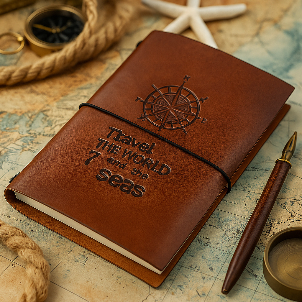 Ať už pro psaní deníku po meditaci, uzemňující afirmace nebo volné psaní před spaním, tento zápisník zve k pravidelné denní praxi. Kompasová růže — dlouho používaná k navigaci cestovatelů — symbolizuje směr a jasnost; na stránce je připomínkou, abyste se řídili svými hodnotami. Na přední straně je nápis „Travel the WORLD and the 7 SEAS,“ jednoduchý podnět k zvědavosti a otevřenosti. Čisté bílé stránky vítají inkoust nebo tužku; tenká černá gumička a malý zlatý přívěsek drží vše pohromadě, připravené kdykoli se vrátíte. Vlastnit krásný zápisník často usnadňuje pravidelné psaní — jednu stránku za druhou — dokud se zvyk nestane tichým kotvou. ✍️