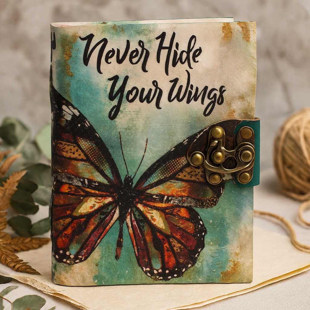 Zde se deník, afirmace a duchovní praxe rozvíjejí vaším tempem — ranní stránky, večerní úvahy, pár řádků vděčnosti. Motýl, široce spojovaný s proměnou a obnovou, se spojuje s připomínkou na obalu „Nikdy neskrývej svá křídla“, aby povzbudil odvahu a autentičnost při psaní. Pečlivě vyrobený a snadno přenosný se stává kotvou: stabilním povrchem pro inkoust nebo grafit a teplým pozváním vracet se na stránku každý den. ✍️