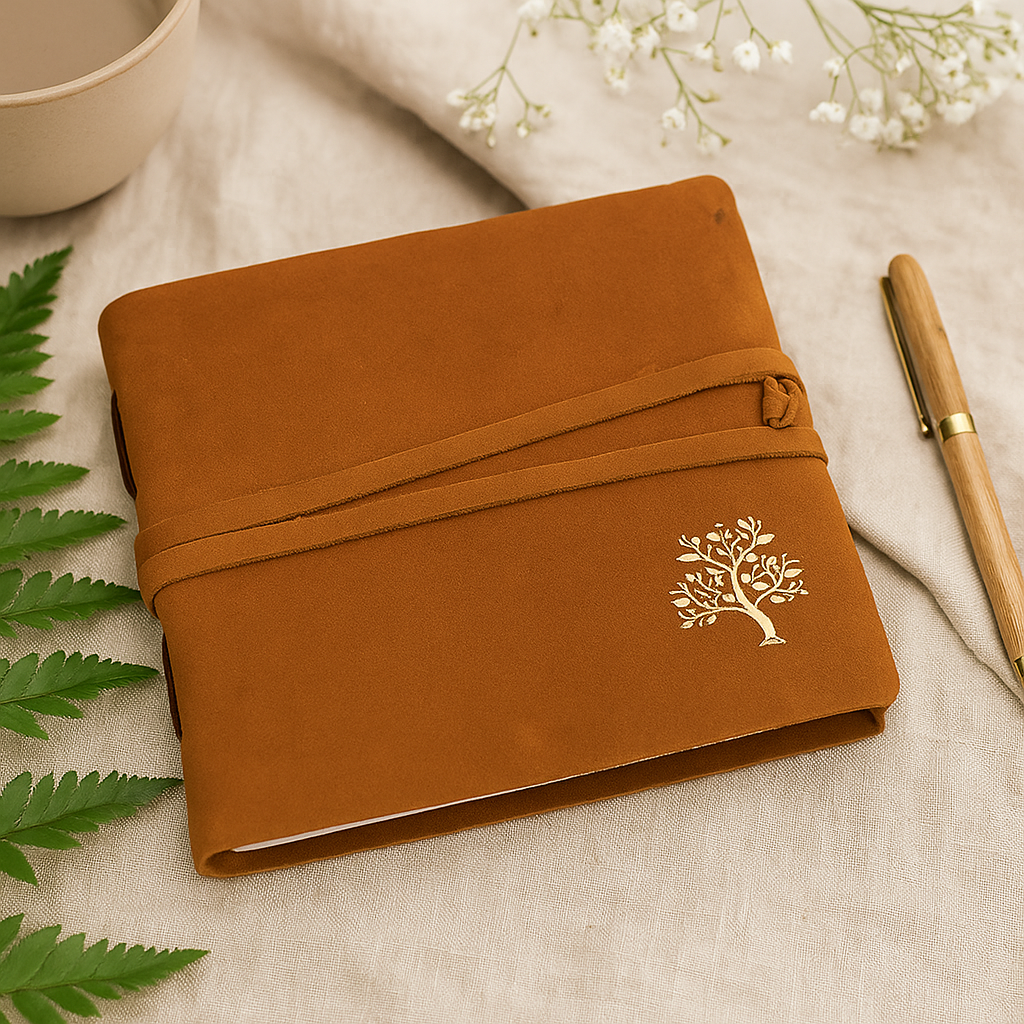 Pod měkkým, semišovým hnědým obalem zachytává světlo malý zlatý strom. Uvnitř mají slova prostor jemně přistát — jasný, soukromý prostor pro myšlenky, emoce a záměry, aby získaly tvar. 🌿