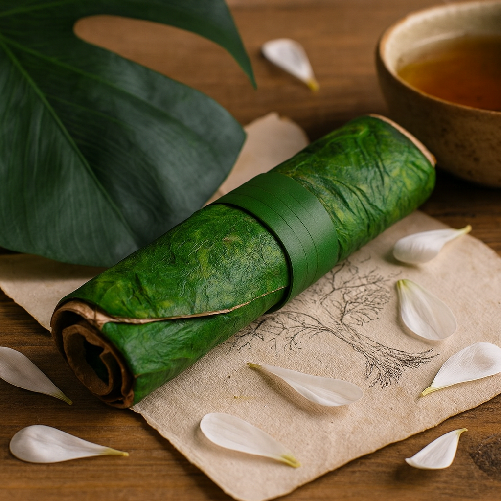 První dotek je chladná, texturovaná kůže v hluboké zelené barvě—rolovaná a držená jednoduchým ladícím páskem. Otevřete ji a vstoupíte do tichého, osobního útočiště, kde myšlenky, emoce a záměry najdou jasné místo k usazení. Toto je nádoba pro to, co je důležité, prostor, kde myšlenky zakoření a začnou nabývat tvaru. 🌿