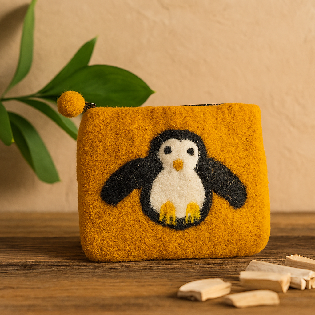 Měkký plst v teplém hořčicovo-ochrovém odstínu dělá z této malé obdélníkové taštičky na zip praktického každodenního pomocníka. Přátelský motiv tučňáka s bílým bříškem a jasným zobákem a nohama přináší hravý nádech. K odpovídajícímu plstěnému bambulce na zipu je pohodlný úchop a hladké otevírání a zavírání.
