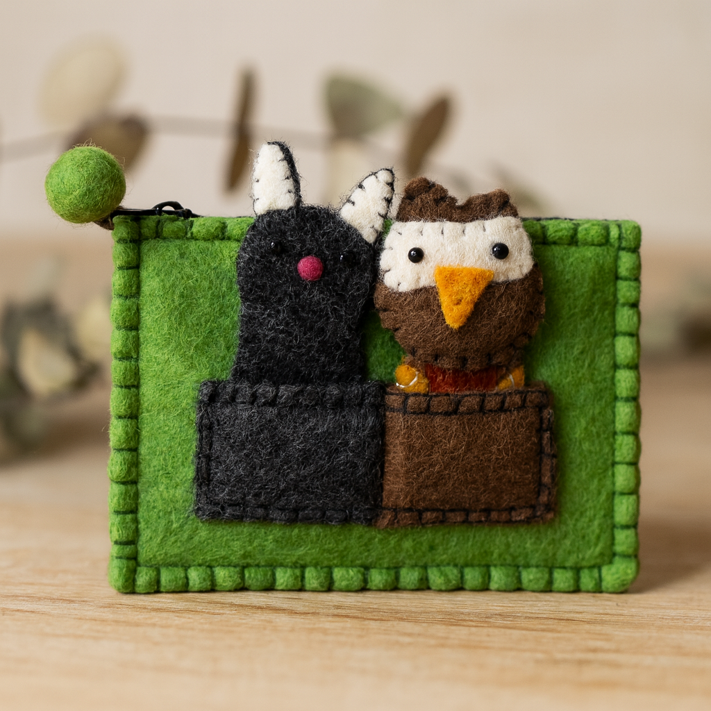 Vyrobeno z polstrované plstěné vlny s ručně dokončeným blanketovým stehem, otevírá se hladce pomocí horního zipu a hmatového filcového poutka, které můžete nahmatat. Na přední straně dva přátelské filcové aplikace – sova a kočka – vykukují z malých kapes, jejich kontrastní stehy přidávají jemné lidové kouzlo. 🦉🐱