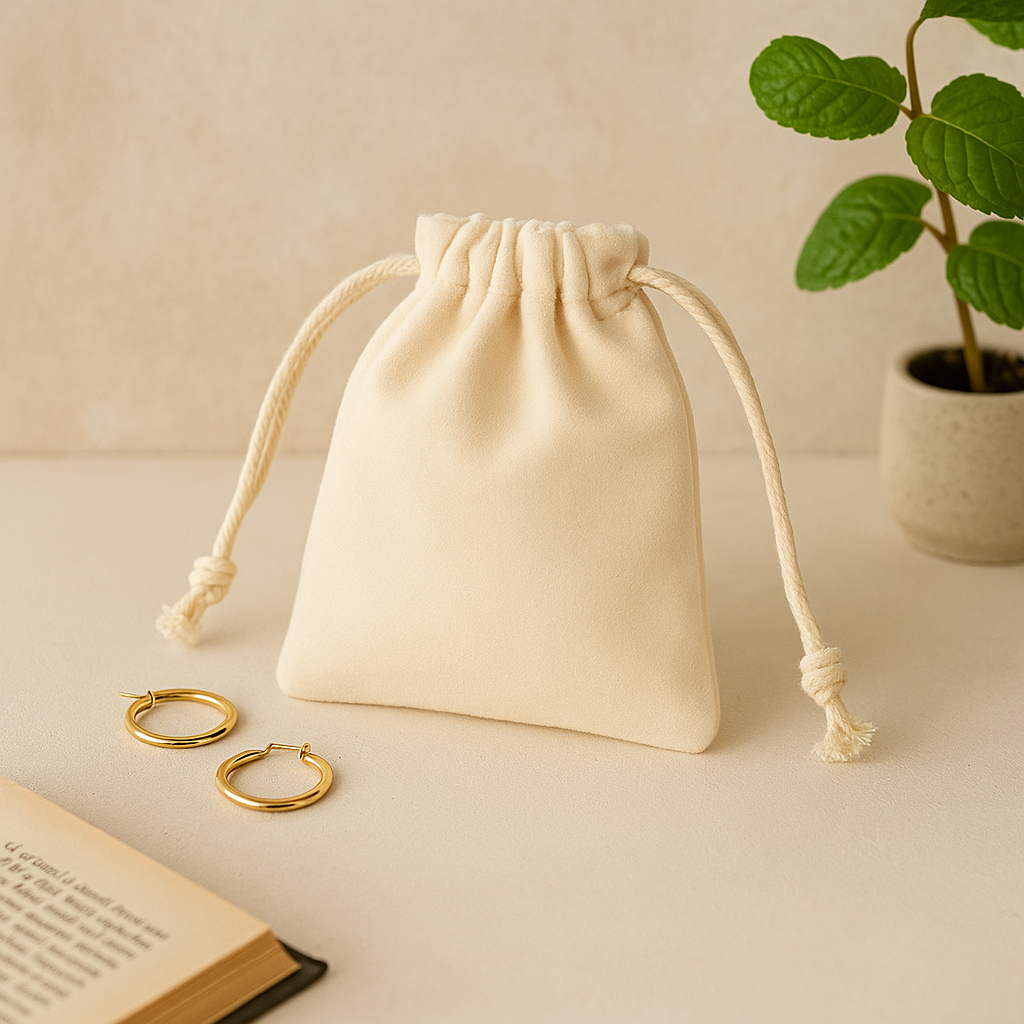 Měkký slonovinový samet, hladký a matný na dotek, stažený úhlednou šňůrkou — kompaktní, praktický sáček na uchování drobností pohromadě. 🌾