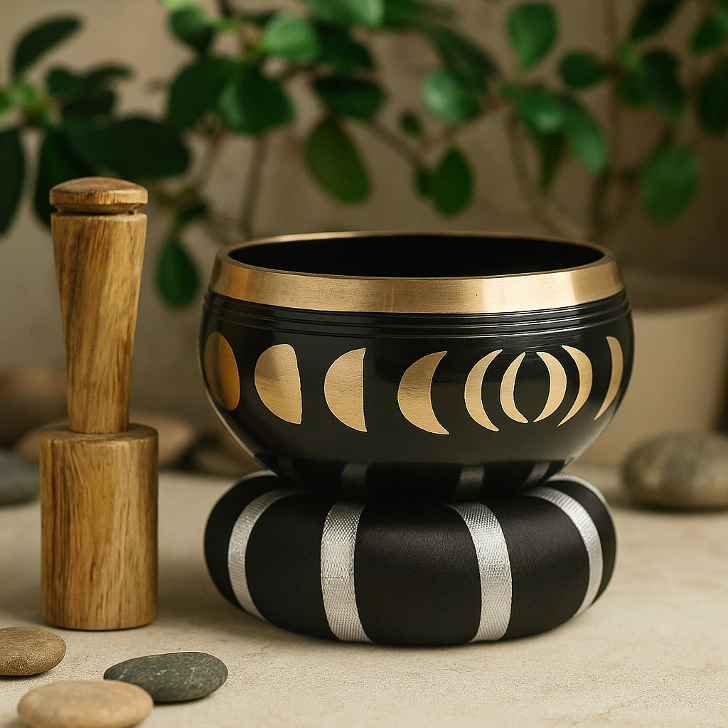 Kovová mísa nese jemný kovový lesk, s černým vnějškem a světle zlatým tónovaným okrajem a vnitřkem. Kolem jejích hladkých stěn obíhá motiv fází měsíce. V mnoha tradicích symbolizují fáze měsíce rytmus, změnu a obnovu — tichou připomínku pohybovat se s cykly a zastavit se k rozjímání. Velikost pro snadné držení (přibližně 10,7 x 6 cm; asi 0,4 kg) nabízí jasný, stálý zvon při poklepání a teplý, trvalý hlas při hraní po okraji.
