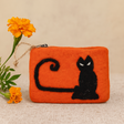 Měkký oranžový filc, teplý na dotek, tvarovaný do malé obdélníkové kapsy s pozornou černou kočkou v aplikaci – stočený ocas, špičaté uši, jasné oči – na přední straně. Kompaktní, praktické řešení pro každodenní organizaci. 🐾