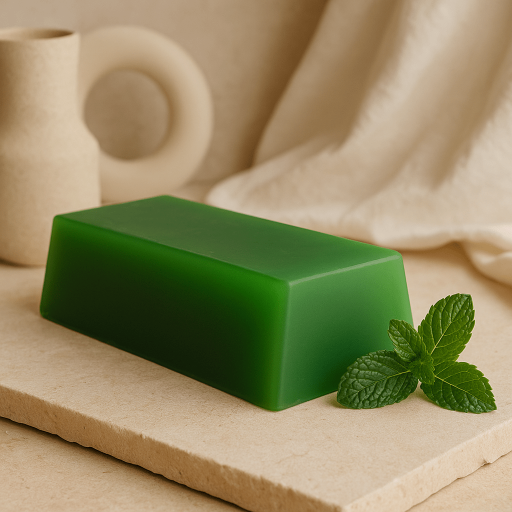 Chladivý, mátově zbarvený zelený bochník s hladkým, matným povrchem a jemně zaoblenými hranami. Praktický a přitom krásný, tento štědrý kus ručně vyráběného mýdla je určen k rozkrájení na jednotlivé kusy – ideální pro každodenní použití a jako promyšlený dárek k sdílení. 🍃