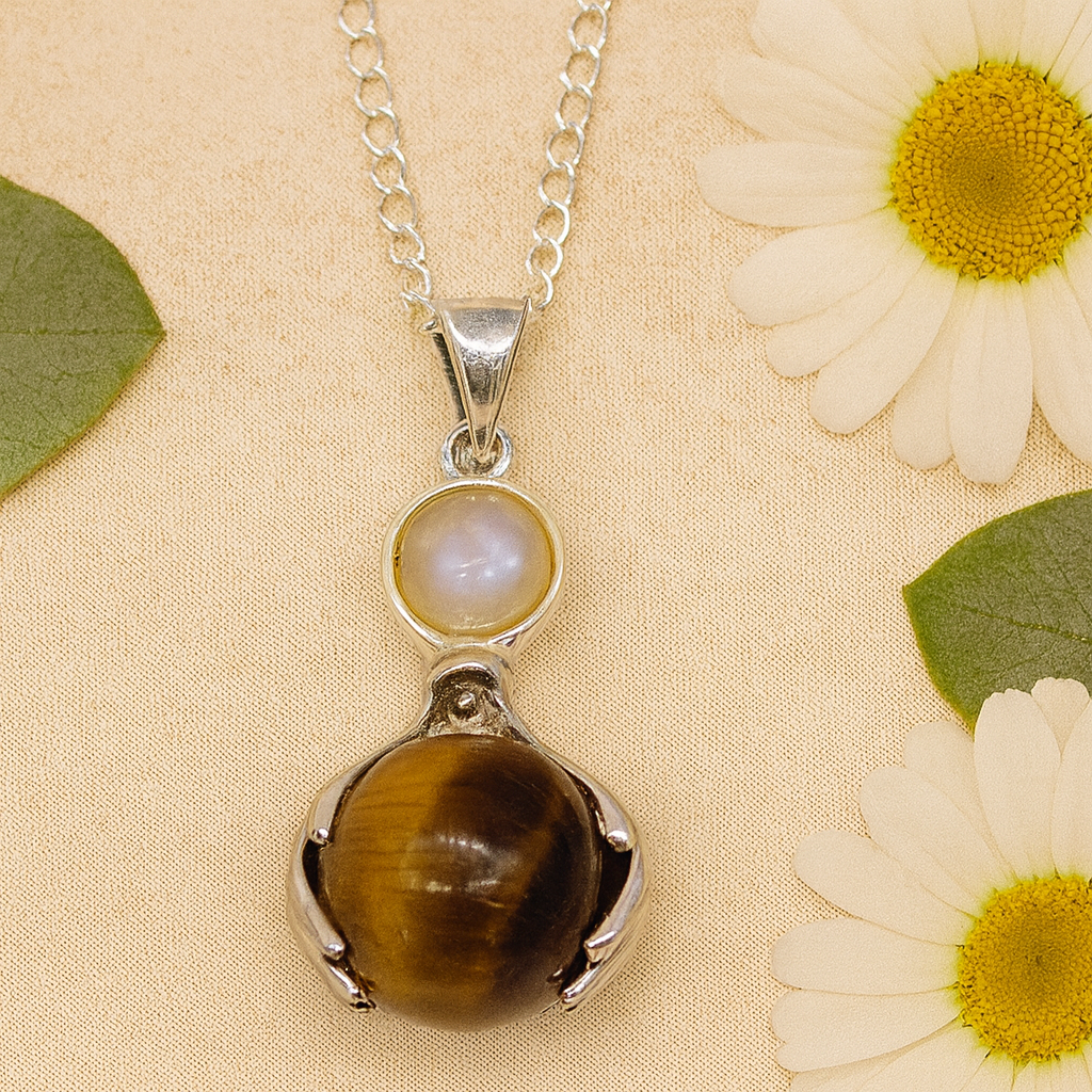 💧 Teplý, páskovaný lesk spočívá blízko srdce: kapkovitý přívěsek objímající tygrův oko, jehož hnědo‑zlatý povrch jemně mění barvu díky chatoyanci. Malý, mléčný kulatý akcent sedí nahoře v leštěném stříbrném otevřeném rámu, zavěšený na jemném kabelovém řetízku.