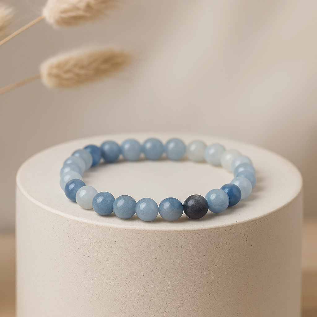 Chladivý a hladký na kůži, náramek spočívá jako souvislý kruh leštěných korálků v jemně modré a něžné šedé, některé s lehkou průsvitností a jeden korálek s hlubším tónem. Nosí se jako ozdoba a jako tichý kotva pro záměr—něco stálého, čeho se můžete dotknout, když se zastavíte a vrátíte k tomu, co je důležité. 🔵