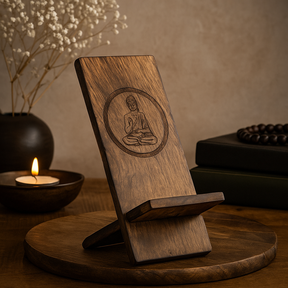 Vyrobeno z masivního dřeva s viditelnou strukturou, stojan působí pevně a uklidňujícím dojmem. Obdélníková zadní část s jemně zaoblenými hranami je nakloněna mírným úhlem a podepřena zadní vzpěrou; integrovaný přední okraj bezpečně drží váš telefon pro handsfree hovory, sledování videí nebo nabíjení. Kruhová rytina na přední straně zobrazuje Buddhu v meditaci — symbol široce spojený se soucitem, všímavostí a vnitřním klidem. V mnoha domácnostech a studiích takový obraz slouží jako tichá připomínka k zastavení; zde dodává každodenní technice klidný nádech. 🧘