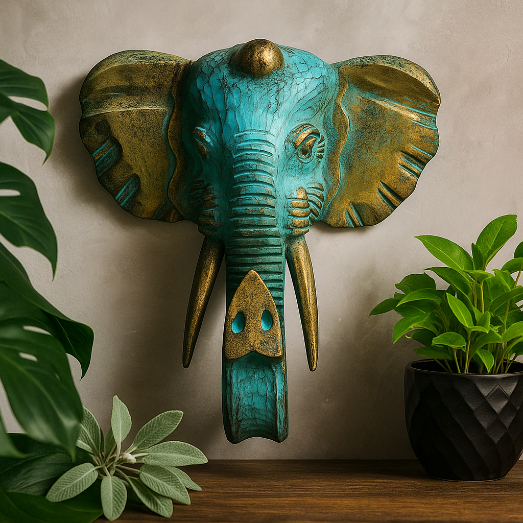 Odborně vyřezávaný a dokončený, tento přední nástěnný kus odhaluje jemné detaily: rýhované uši rámující obličej, prodloužený žebrovaný chobot se dvěma malými kapkovitými výřezy pod očima a dvojité přední kly. Opotřebovaný, zvětralý povrch ukazuje jemné praskliny a skvrnitou patinu, s hlubšími stíny v prohlubních, které přidávají hloubku a klidnou přítomnost. Jemné bronzovo-zlaté zvýraznění zjemňuje tyrkysové tóny a dává soše starobylý, časem milovaný charakter. ✨