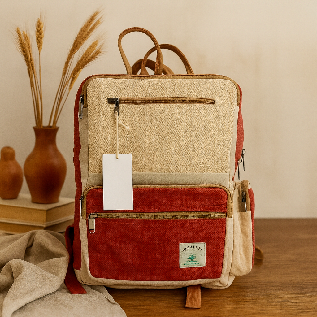 Kig på stofmærket foran, der stolt bærer ordene "HIMALAYAN" og "HEMP", en hyldest til rygsækkens oprindelse og det bæredygtige materiale, der er brugt. Dette stykke er mere end bare en rygsæk; det er et symbol på mindful livsstil, et bevis på den harmoniske blanding af tradition og modernitet.