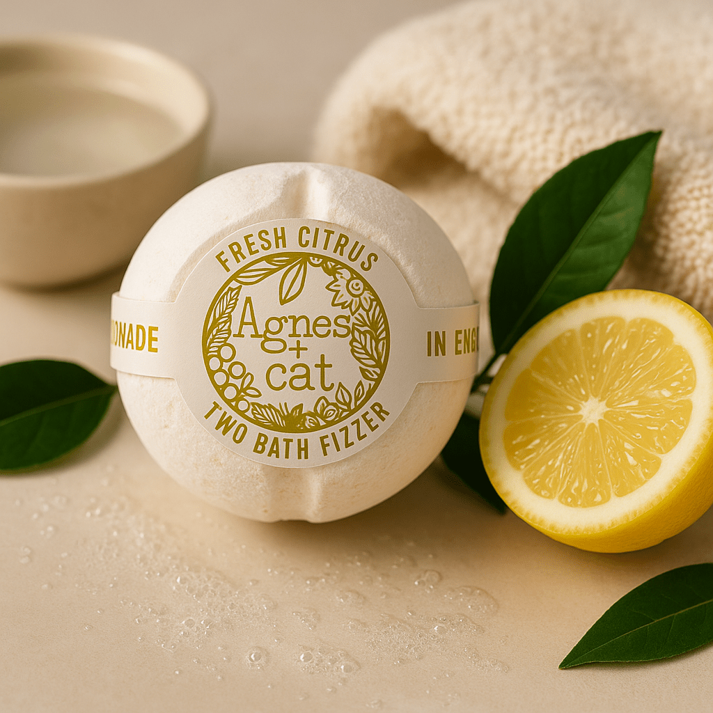En glat hvid kugle møder varmt vand og springer til live — en glad brus af små bobler, en lys citronduft i luften og et øjeblik til bare at nyde. 🍋