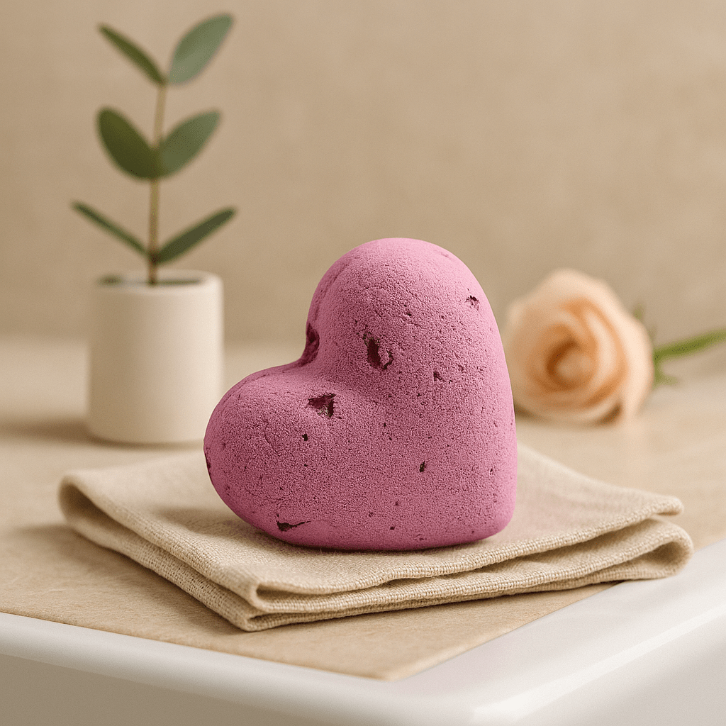 Holdt i hånden er dette hjerte blødt afrundet og mat at røre ved—pink-mauve med naturlige pletter, der vidner om stille håndværk. Slip det i varmt vand for at markere en blid pause, omhyggeligt lavet i Storbritannien. 💗