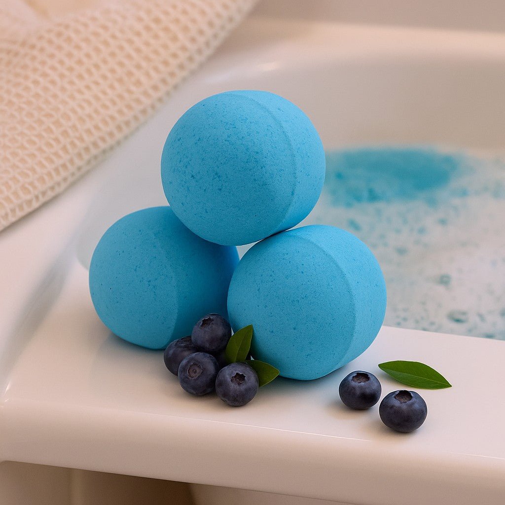 Små, lyseblå kugler hviler i hånden — glatte og matte med en blid ækvatorial søm. Drop dem i varmt vand, og de bruser væk i bløde hvirvler, og frigiver den søde, saftige duft af modne blåbær. En let måde at bringe ro og glæde til badetiden.