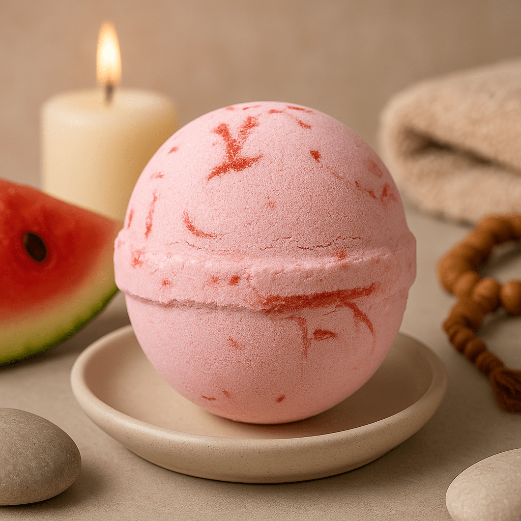 🍉 Glat, pulveragtig og marmoreret i blush-lyserød med dybere røde bånd, hviler denne kugle let i din håndflade. Læg den i et varmt bad for at begynde en lille, rolig ritual — frisk, sød vandmelon løfter luften, og rummet føles blødere.