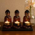 Tre siddende hengivne hviler i rolig symmetri på en rektangulær, mat-sort base. Tekstureret krøllet hår, blidt definerede træk og draperede klæder i dyb, tidløs rød skaber en sammensat silhuet. Den malede, antik-inspirerede finish giver en subtil patina, med gyldne skåle berørt af bløde, sortnede accenter. Hver rund skål holder et fyrfadslys sikkert, og balancerer dekoration med formål. En respektfuld nik til buddhistisk hengivenhedskunst guider formen uden overflod. 🌙