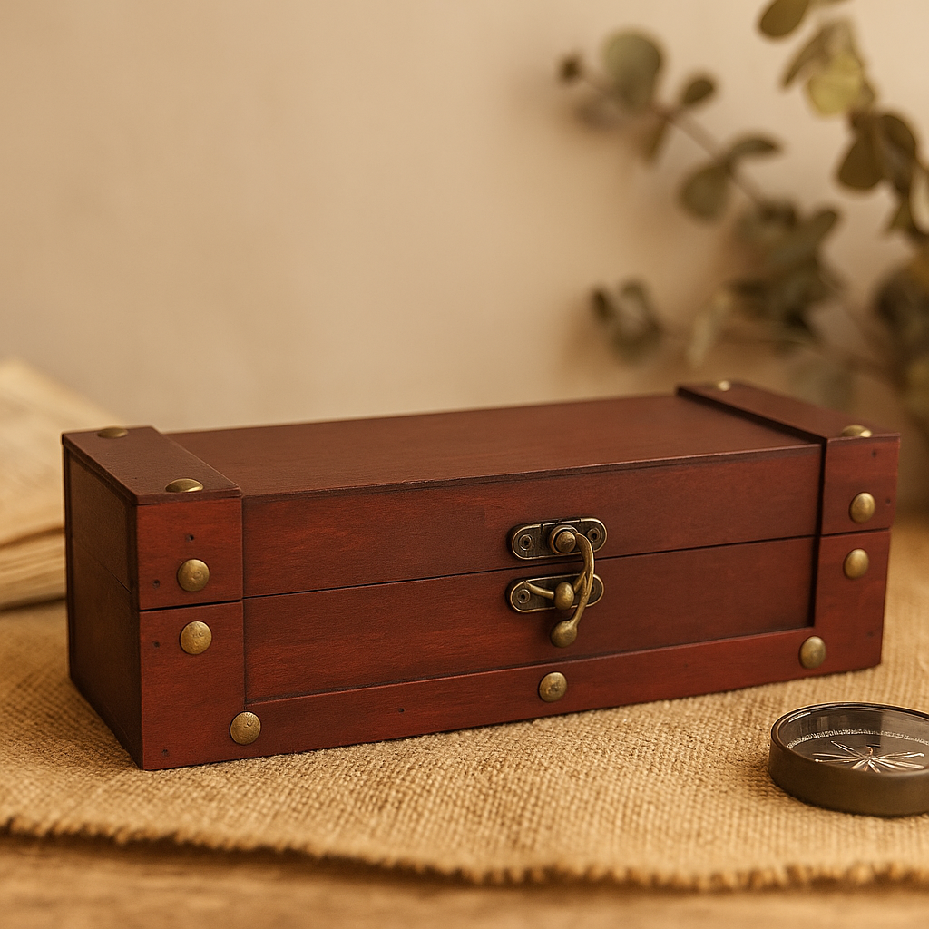Fremstillet i træ med en glat finish, der lader åren diskret komme til syne, føles dens lange rektangulære form solid i hånden. Firkantede hjørner er indrammet af tykkere endeskinner, mens messingfarvede rundhovedede nitter følger kanterne. En svinglås lukker fronten med et blidt klik, og den dybe rødbrune bejdse bringer varme med subtile variationer. Stil den på en konsol, ved siden af sengen eller på arbejdspladsen; fyld den med kontorartikler, rejseminder eller te. En betænksom gave, når den gives med en håndskrevet note indeni. 🎁