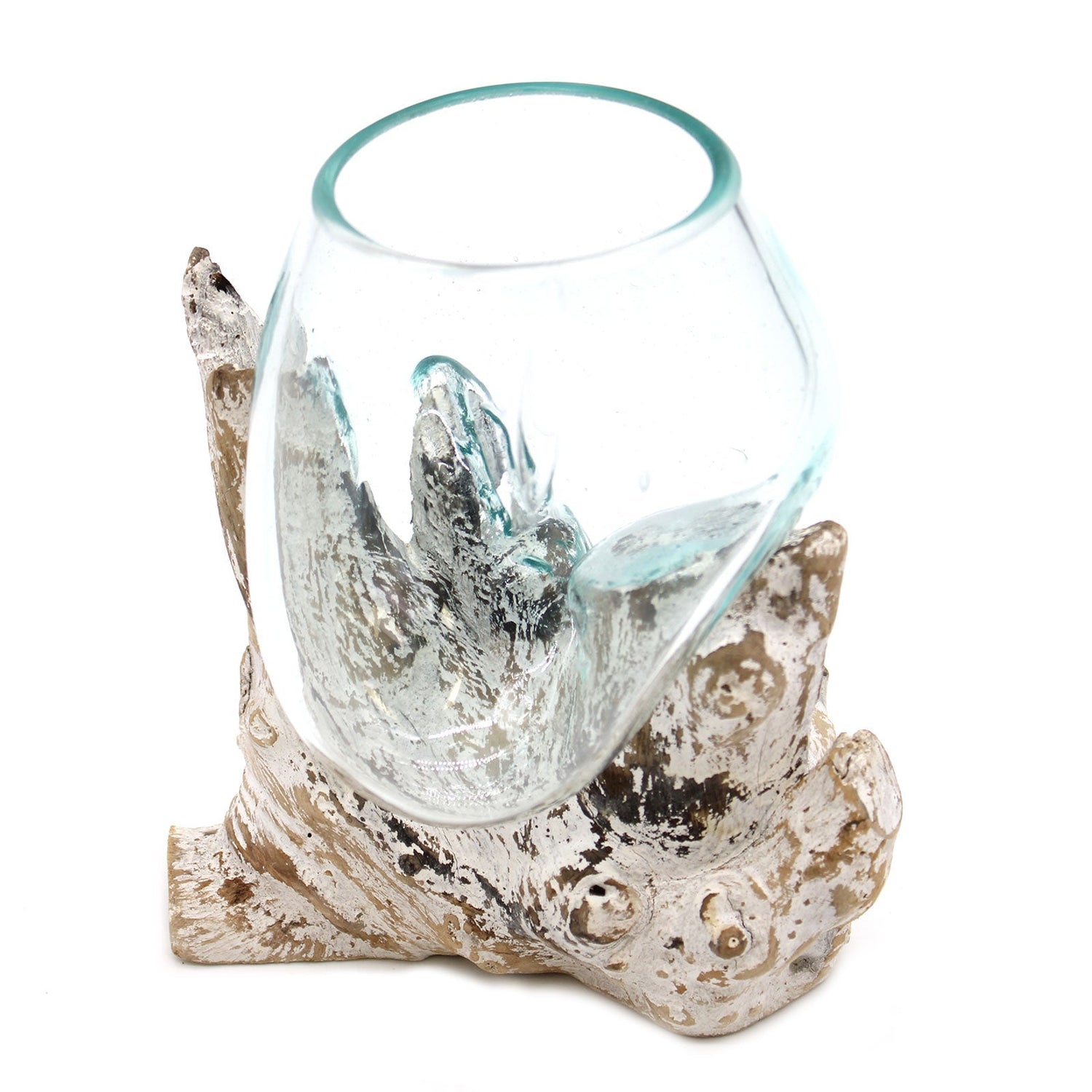 Smeltet glas skål på drivtømmer base, 18cm er udsolgt og vil blive sendt, så snart det er på lager igen.