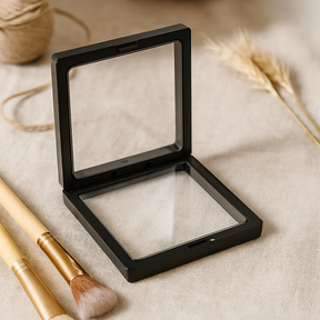 To gennemsigtige lag holder forsigtigt dit stykke på plads og skaber en ophængt silhuet, der fanger blikket. Den glatte hængsel åbner med et blødt tryk for nem placering og lukker derefter for at holde støv væk. Fotografier, små kunstværker, pressede blade, mønter, ædelstene eller en yndlingsvedhæng føles alle løftet og smukt indrammet.