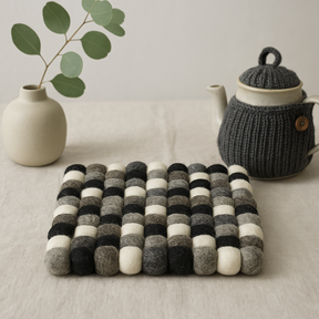 Bløde, tæt filtede uldkugler samles i en pæn firkant, der bringer stille tekstur og rolig struktur til bordet. I lagdelte grå nuancer ligger den behageligt under en kop, skål eller lille fad – og fungerer også som base for en vase eller lys – og beskytter din overflade, mens den tilføjer en blid, taktil note.