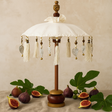 Fremstillet med en rund, let buet canvas-kaleche i rolig creme, står den på en varm brun træstang og et trappet fodstykke med subtile guldfarvede ringe. En udskåret knopp kronrer stykket, med en lille stofknude nedenunder, en syet kant og hængende creme kvaster trådet med træ- og guldfarvede perler; sølvfarvede bladvedhæng tilføjer en delikat glans, mens de svajer. I balinesisk tradition optræder ceremonielle parasoller (tedung) ved templer og festivaler som symboler på beskyttelse, ærbødighed og fejring—placeret for at ære det hellige og invitere en festlig, omsorgsfuld atmosfære i dagligdagen. 🌿