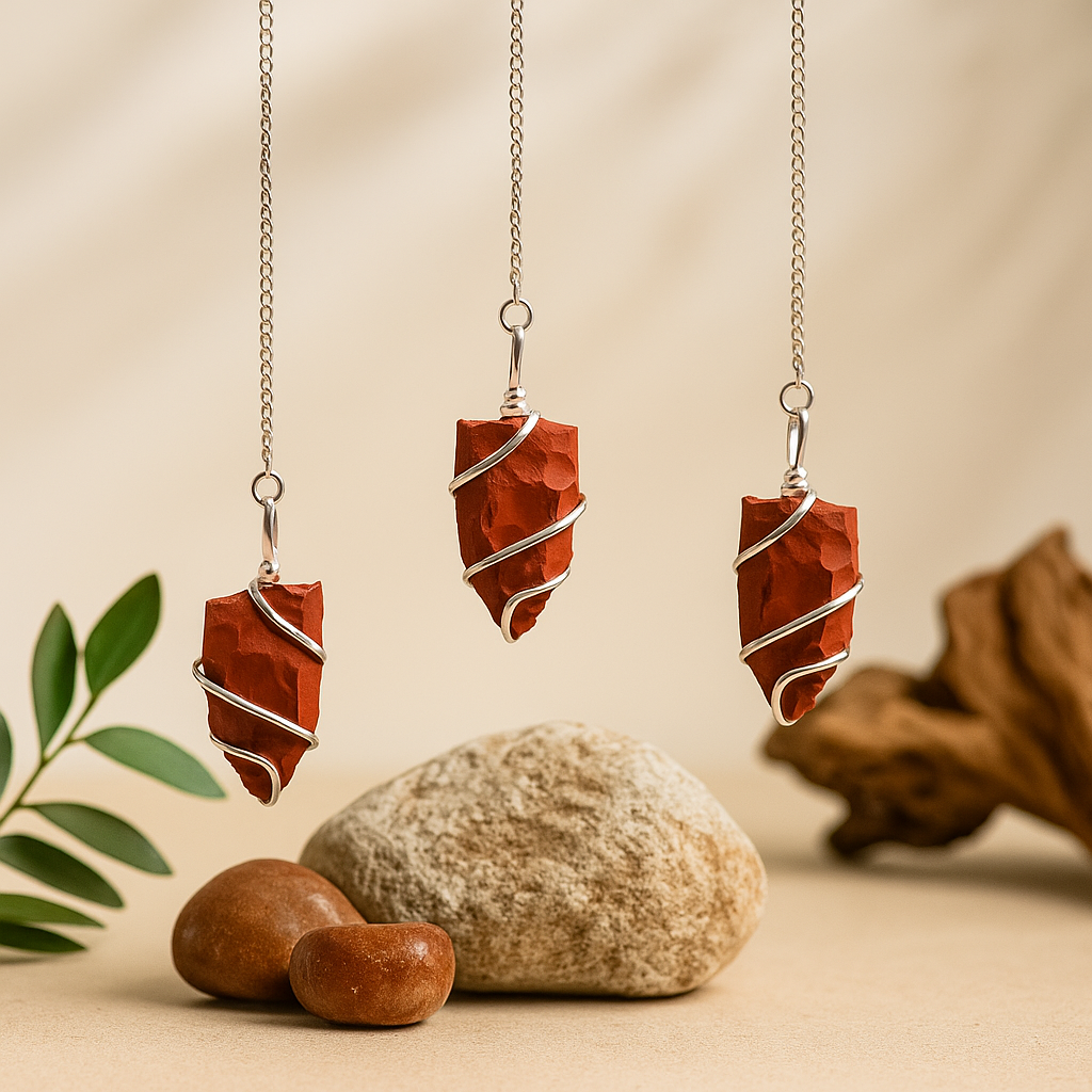 En rå, murstensrød skår af jaspis hænger fra en fin sølvfarvet kæde, dens matte overflade og kantede kanter giver en jordnær fornemmelse i hånden. En enkel, oprigtig pendul til stille vejledning, intuition og stabilt fokus. 🧘
