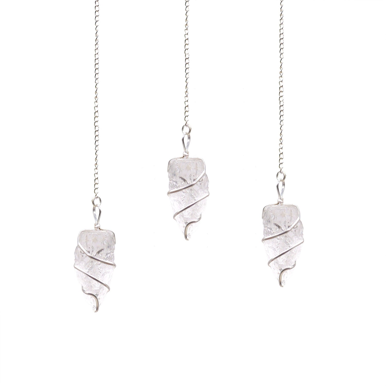 Den kølige vægt af rå klar kvarts hviler let i hånden. En fin sølvfarvet kæde glider blødt, mens stenen finder sit centrum, hvilket gør dette pendul til et enkelt, meningsfuldt værktøj til blid vejledning og fokus. 🧘