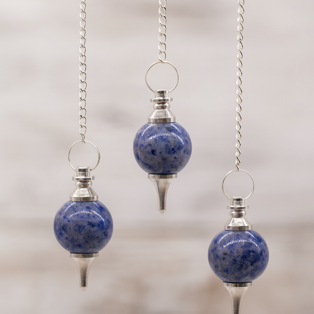Kølig at røre ved hviler en dybblå sodalitkugle under en sølvfarvet kæde, dens plettede mønster fanger blødt lys, mens den falder til ro. En enkel, afbalanceret pendul til øjeblikke, hvor du ønsker, at dine tanker skal falde til ro, og din indre stemme træde frem. 🔵