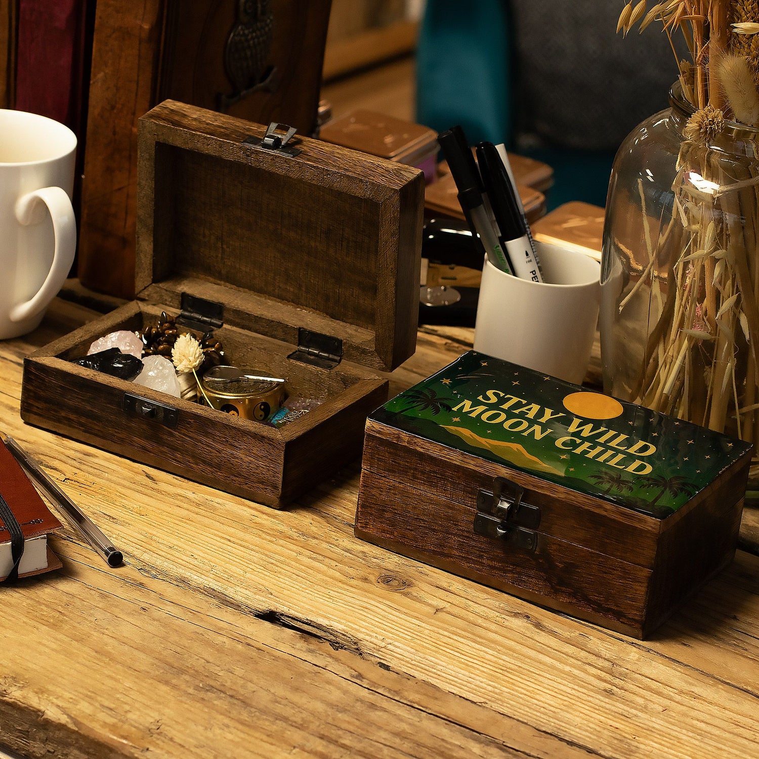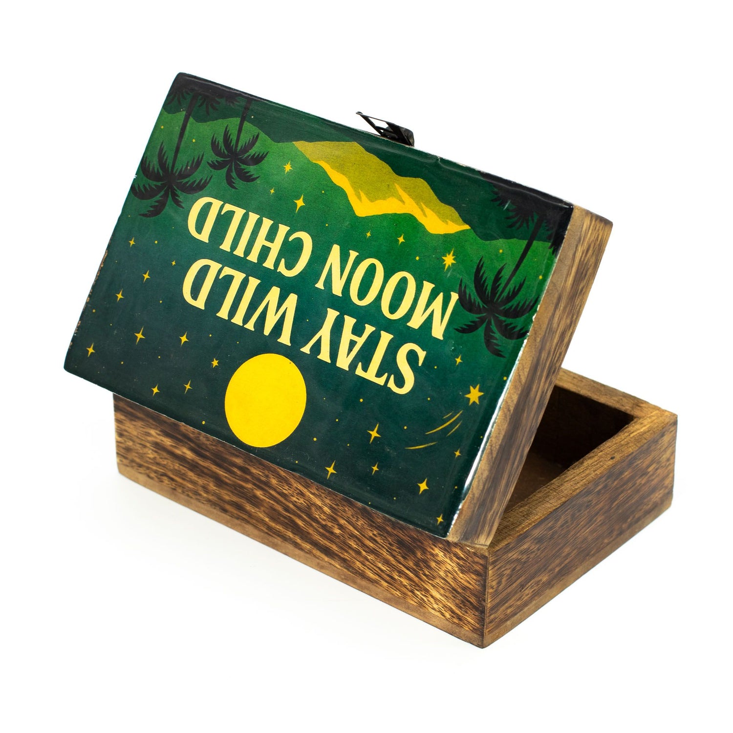 En mellemstor æske i mangotræ med et emaljeret låg med designet "Stay Wild Moon Child" — månebelyste himle, fjerne bjerge og palmesilhuetter, der skaber en rolig, eventyrlysten stemning. Håndlavet i Indien med en metal-lås.