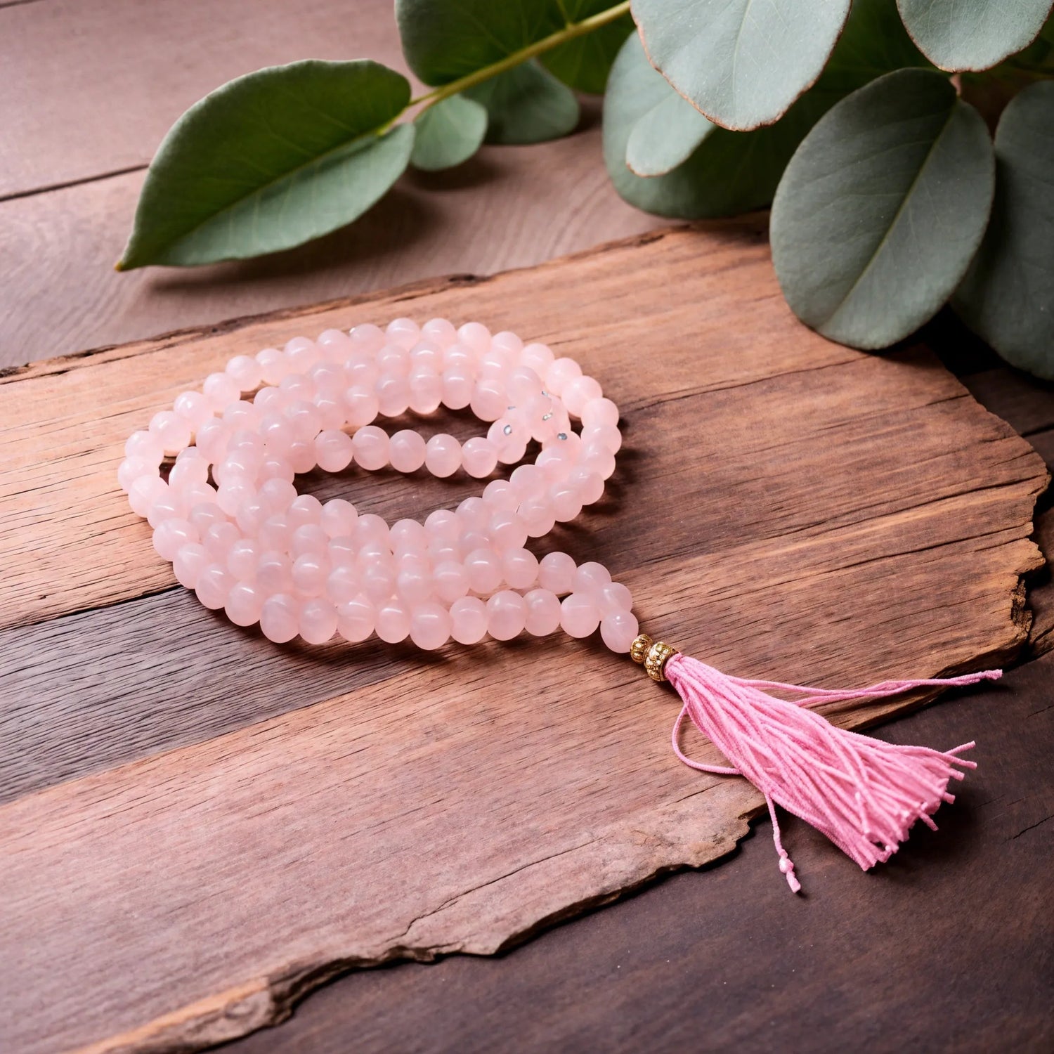 I både hinduistisk og buddhistisk praksis støtter mala-perler japa—gentagelse af en mantra perle for perle for at dyrke fokus, nærvær og erindring. Tallet 108 er bredt respekteret i disse traditioner og tilbyder en komplet cyklus til meditation eller bøn. Rosenkvarts, en lyserød variant af kvarts, har længe været værdsat for sin blide farve og glatte fornemmelse; i mange kulturer symboliserer den medfølelse, ømhed og hjertelig forbindelse. Opbevaret i et meditationsrum eller båret mellem sessioner fungerer den som en rolig påmindelse om intention.