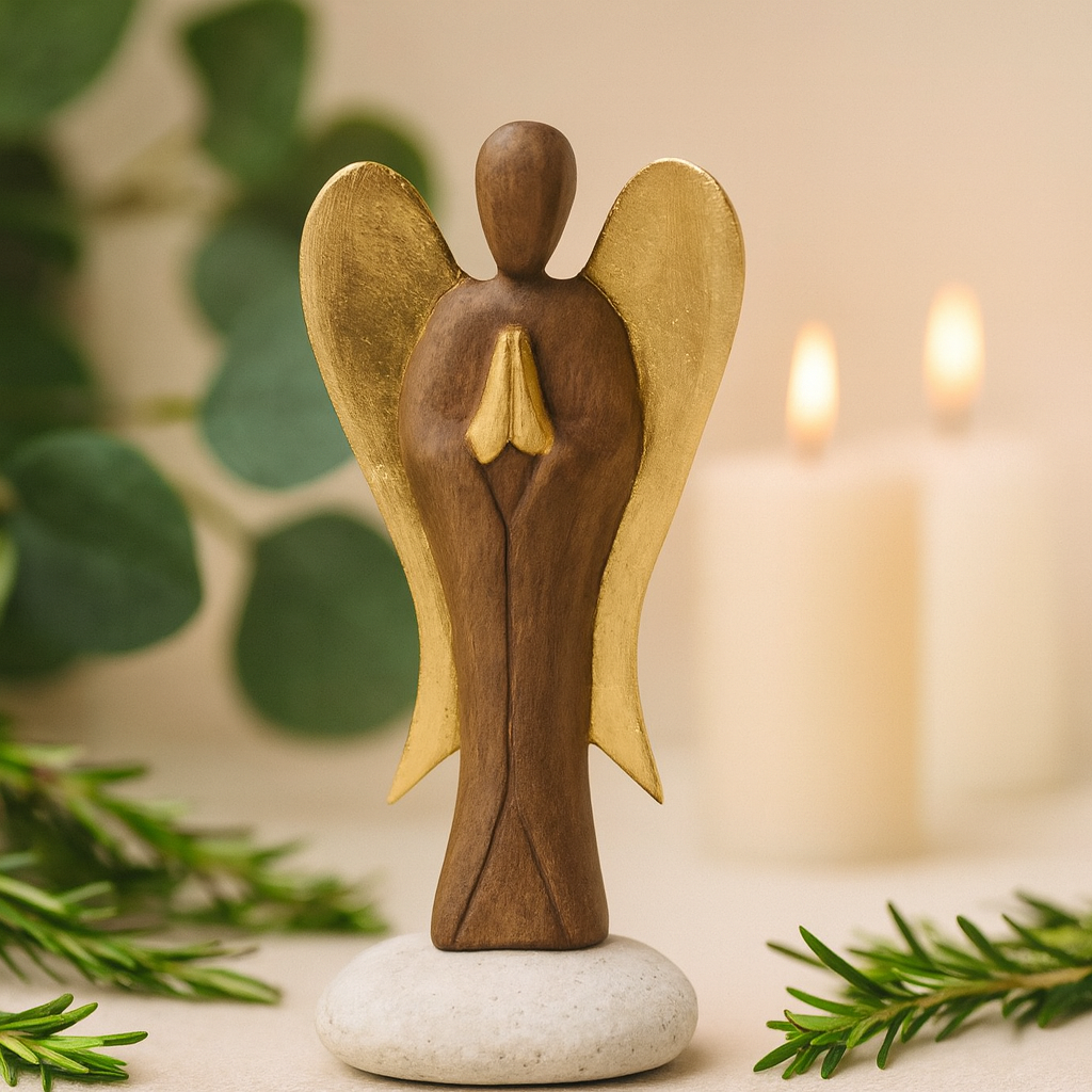 🌟 Werten Sie Ihre Inneneinrichtung mit dem neuen Hati-Hati-Schutzengel auf, einer 20 cm großen, handgefertigten Suar-Holzfigur aus Indonesien. Dieses elegante Stück hat eine glatte, braune Oberfläche und goldene Flügel, die Frieden und Schutz symbolisieren. Die Hände des Engels sind in einer Gebetshaltung gehalten und verkörpern Gelassenheit und spirituelle Anmut.
