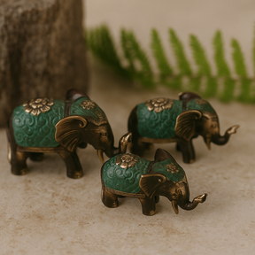 Das Set fängt das Licht auf stille Weise ein – eine tief bronzebraune Oberfläche mit einer sanften antiken Patina, türkisgrüne Paneele mit kunstvollen Mustern und goldfarbene Blumenmedaillons, die sanft am Kopf und Rücken leuchten. Die abgerundeten Formen fühlen sich glatt an, mit erhobenen Rüsseln, kleinen Stoßzähnen und aufmerksamen Ohren, die jedem Elefanten einen ruhigen, würdevollen Charakter verleihen. 🐘