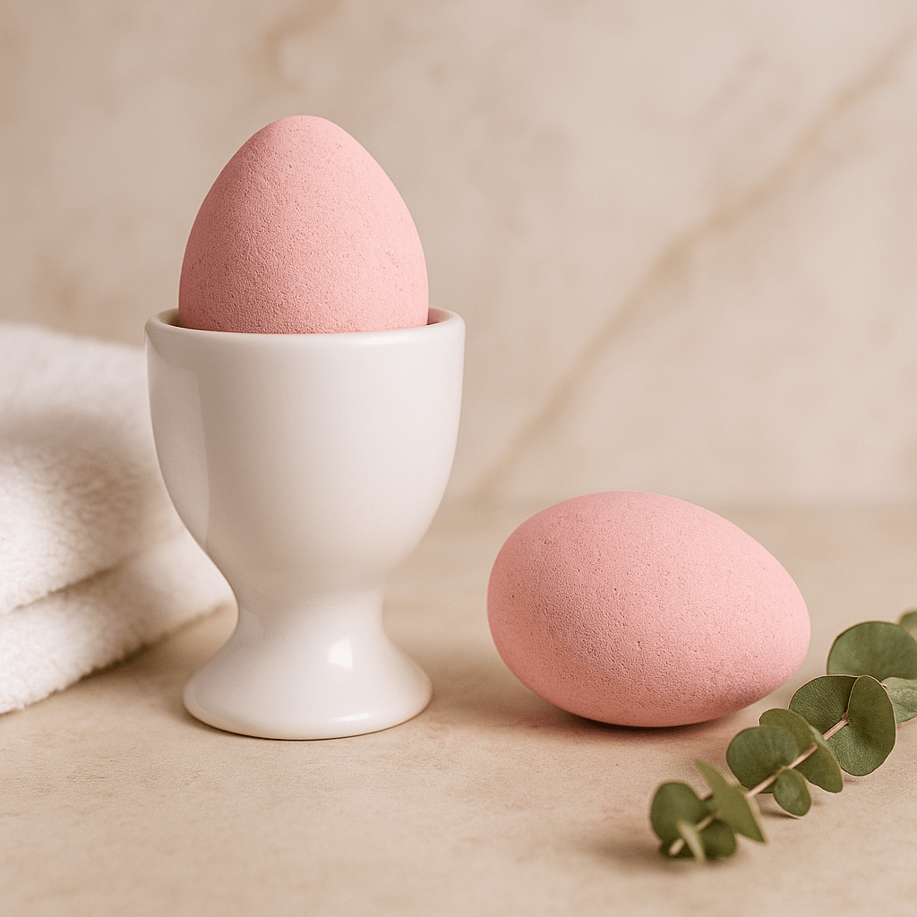 A petite, blush-pink bath egg rests in your palm with a soft, matte finish. Slip it into warm water and listen as the gentle fizz begins — a small, steady ritual that invites breath to slow and shoulders to drop. 🛁