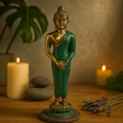 Verschönern Sie Ihren Raum mit der Med-Standing-Buddha-Statue aus Indonesien. Dieses exquisite Stück zeigt einen ruhigen Buddha mit goldenem Kopf, Brust und rechtem Arm, der in ein grünes Gewand gehüllt ist. Diese Statue steht auf einem dekorativen Sockel mit goldenen Akzenten und ist ein Symbol für Frieden und Ruhe.