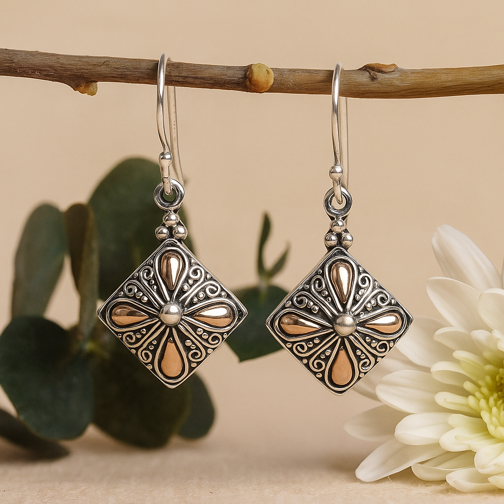 Entdecken Sie den Charme unserer quadratischen Tropfenohrringe aus Silber und Gold, handgefertigt in Indonesien. Diese Ohrringe haben einen quadratischen Anhänger, der mit filigranem Blumenfiligran, einem erhabenen Punkt in der Mitte und zarten Schnörkeln verziert ist. Die Mischung aus 18 Karat Gold und 925er Silber bietet eine zeitlose Eleganz, perfekt für jeden Anlass. 🌸