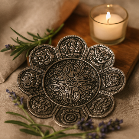 Normaler Preis £213Grundpreis /Nicht verfügbarAuf LagerRäucherstäbchenhalter aus poliertem Aluminium mit tibetischen Symbolen, 12 cm
