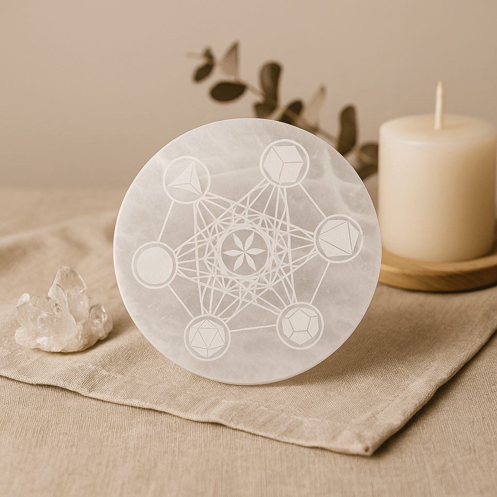 Ladeplatte mit Heiliger Geometrie, Selenit, 18 cm