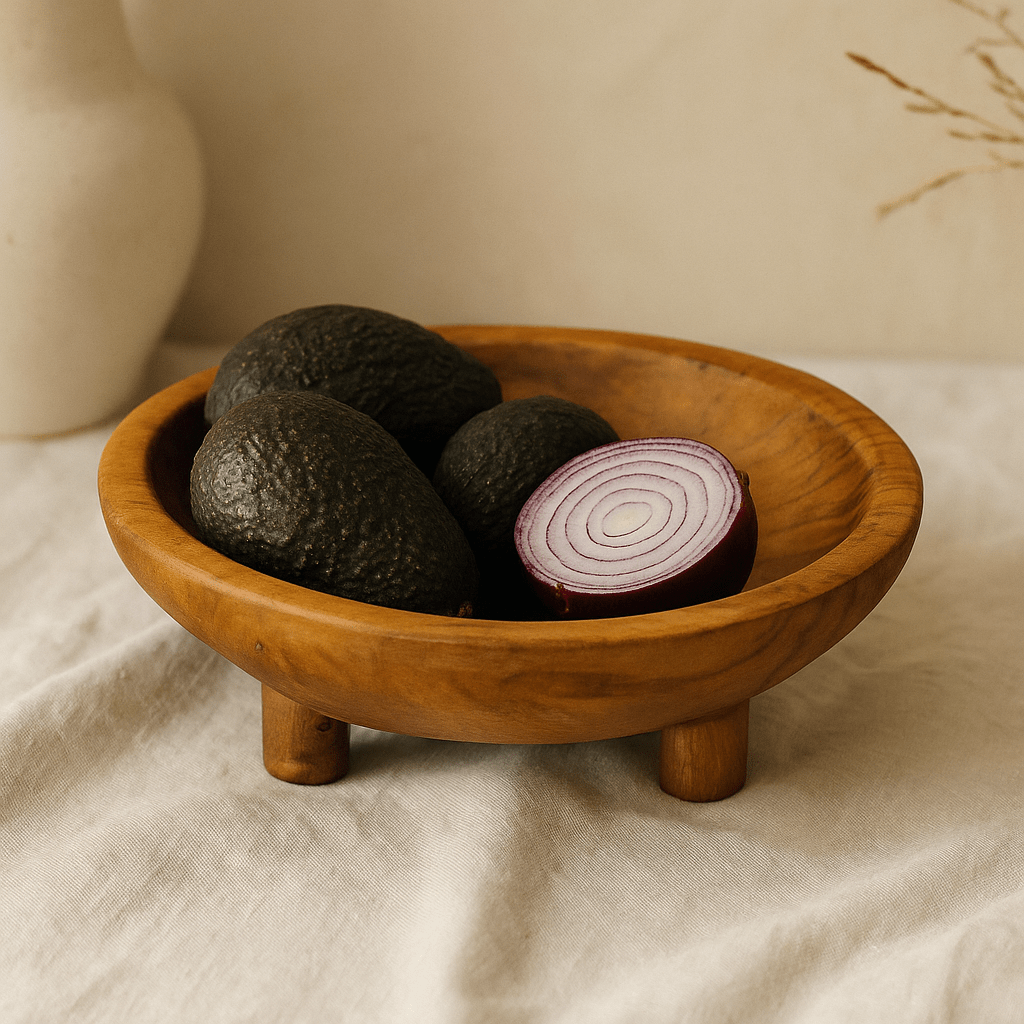 🍐 Warm, solid teak with a smooth, satin touch rests on quiet little legs. A shallow, wide bowl that lifts fruit into view and turns the daily reach for an apple into a gentle ritual.