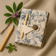 Softly textured lokta paper, flecked with blue cotton and gently marbled in blue–purple, gives this compact journal a calm, tactile feel. A triangular flap folds neatly over the pages, fastening with a wrap-around cotton string and round wooden button. A slim wooden pencil sits alongside, ready whenever a thought lands. 🌿